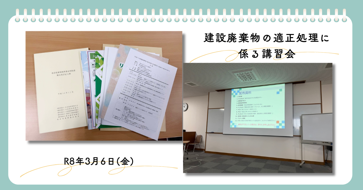 建設廃棄物の適正処理に係る講習会を受講しました 2026 3/11 その他 2026年3月6日2026年3月11日 建設廃棄物の適正処理に係る講習会を受講しました。建設工事における廃棄物の適切な取り扱いについて、理解を深める機会となりました。今後の業務にも活かしてまいります。 その他 よかったらシェアしてね! URLをコピーしました! URLをコピーしました! コメント コメントする コメントをキャンセルコメント ※ 名前 ※ メール ※ サイト 次回のコメントで使用するためブラウザーに自分の名前、メールアドレス、サイトを保存する。